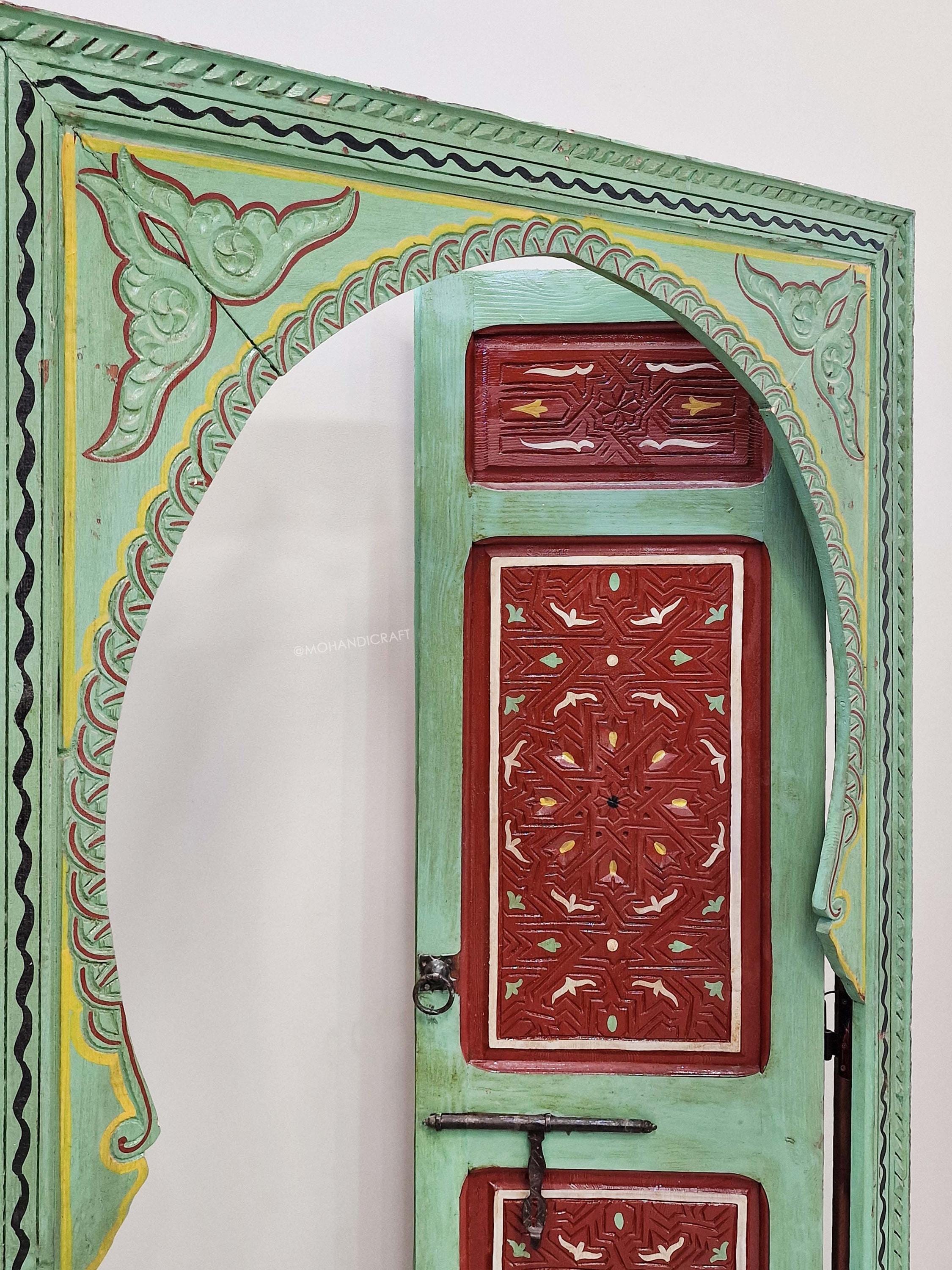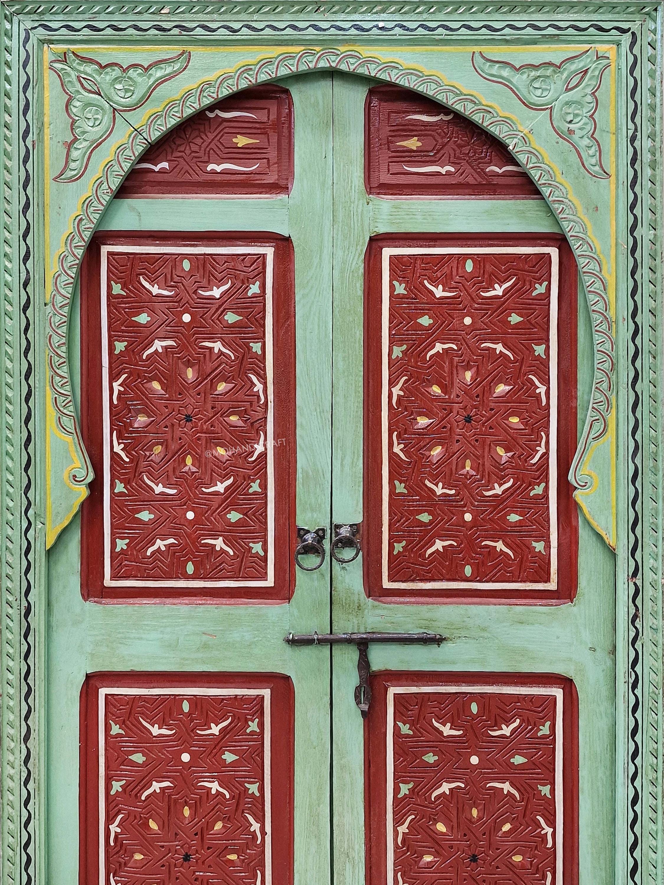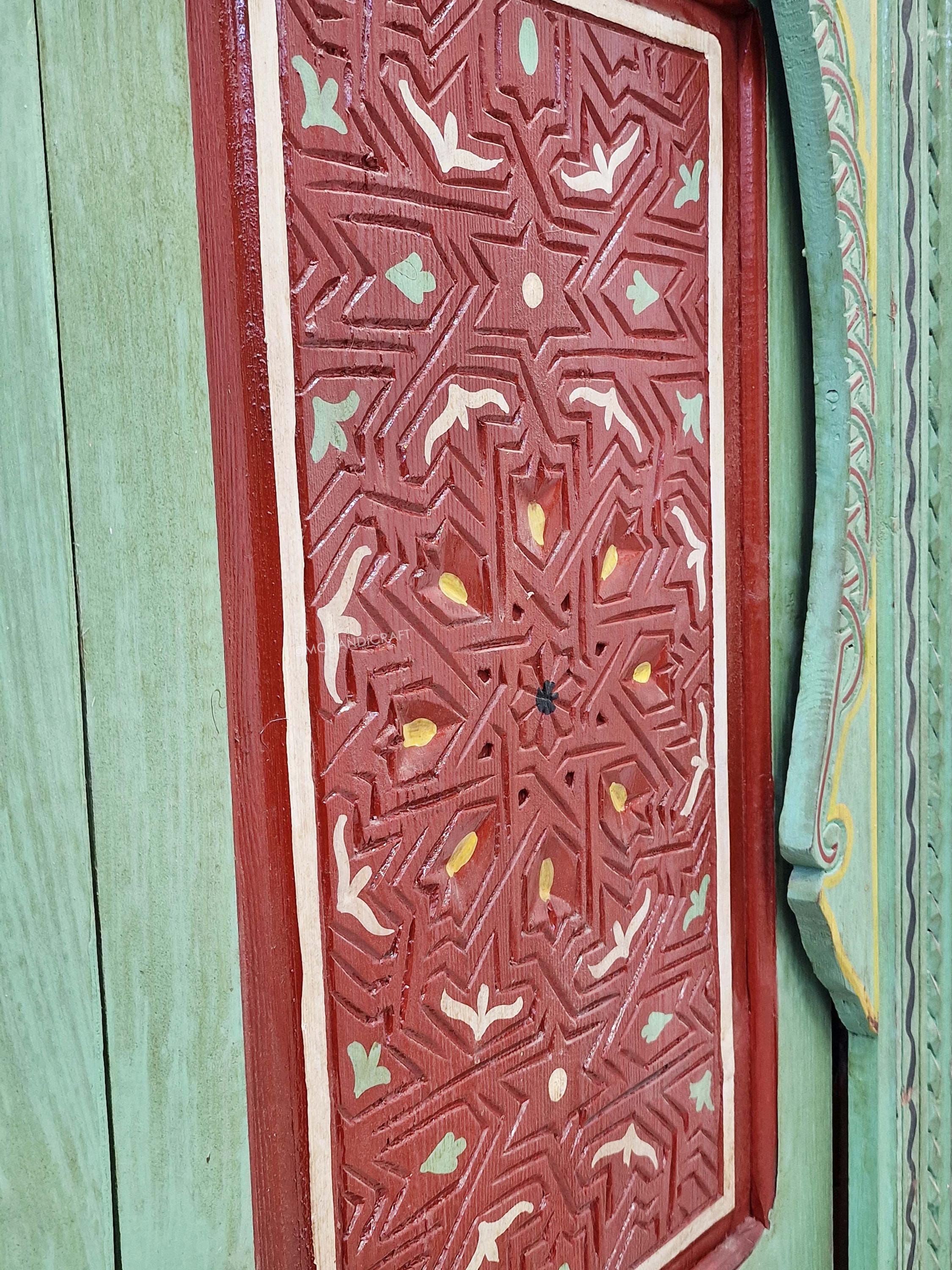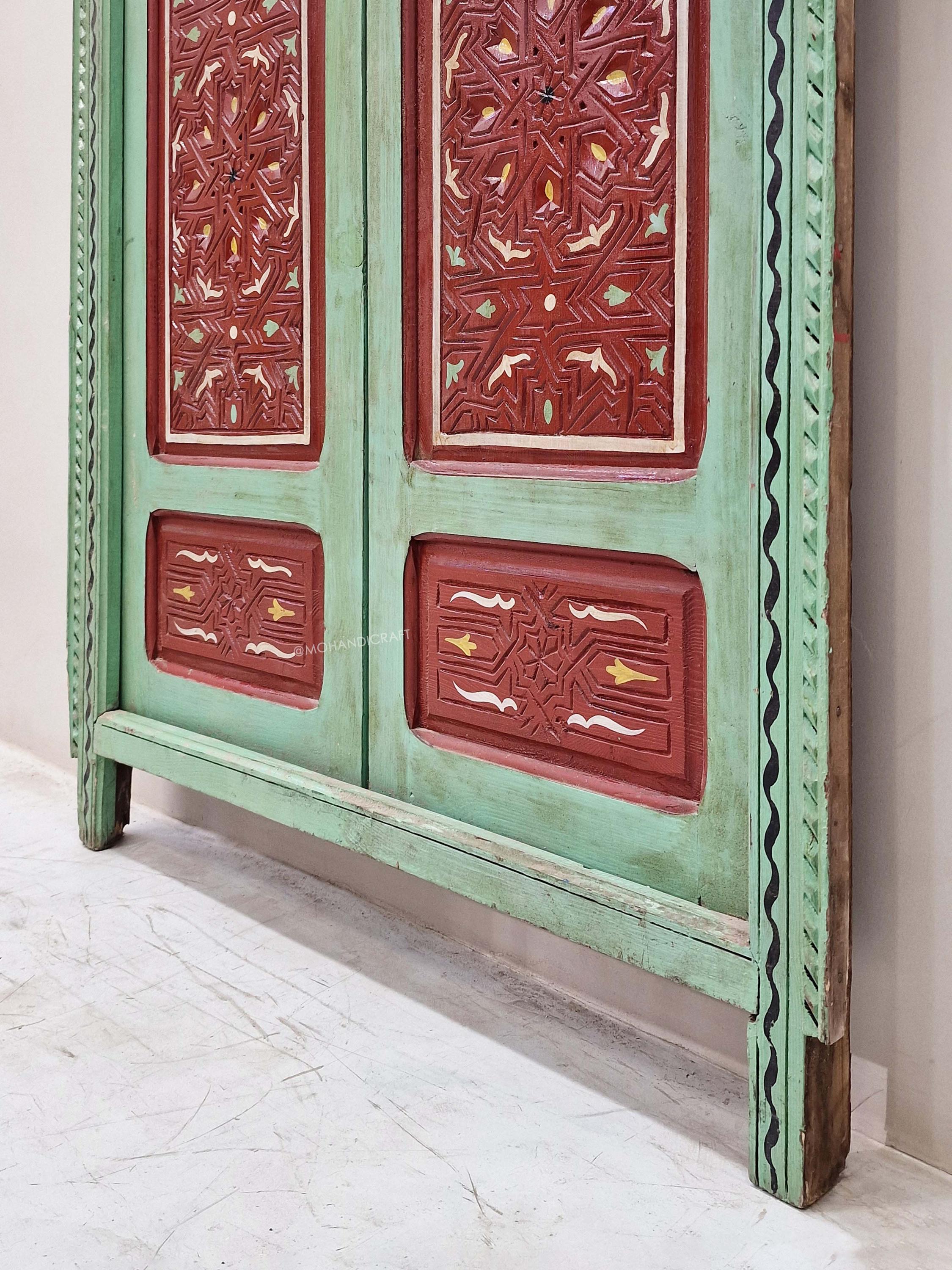Hand-Carved Moroccan Wooden Door, Green & Dark Red Wall Decor, Double-Panel Arched Moroccan Door, Traditional Handcrafted Berber Door.