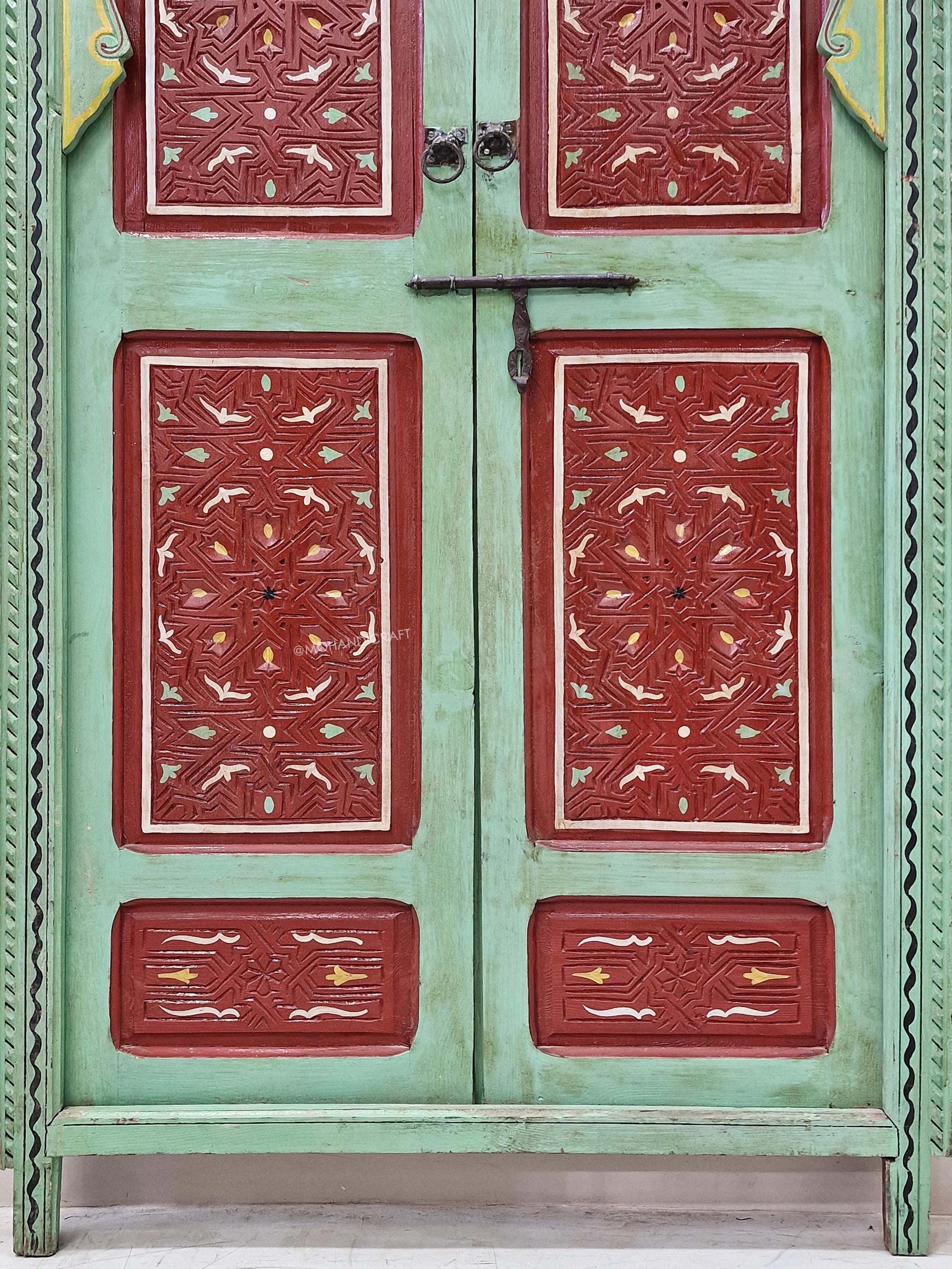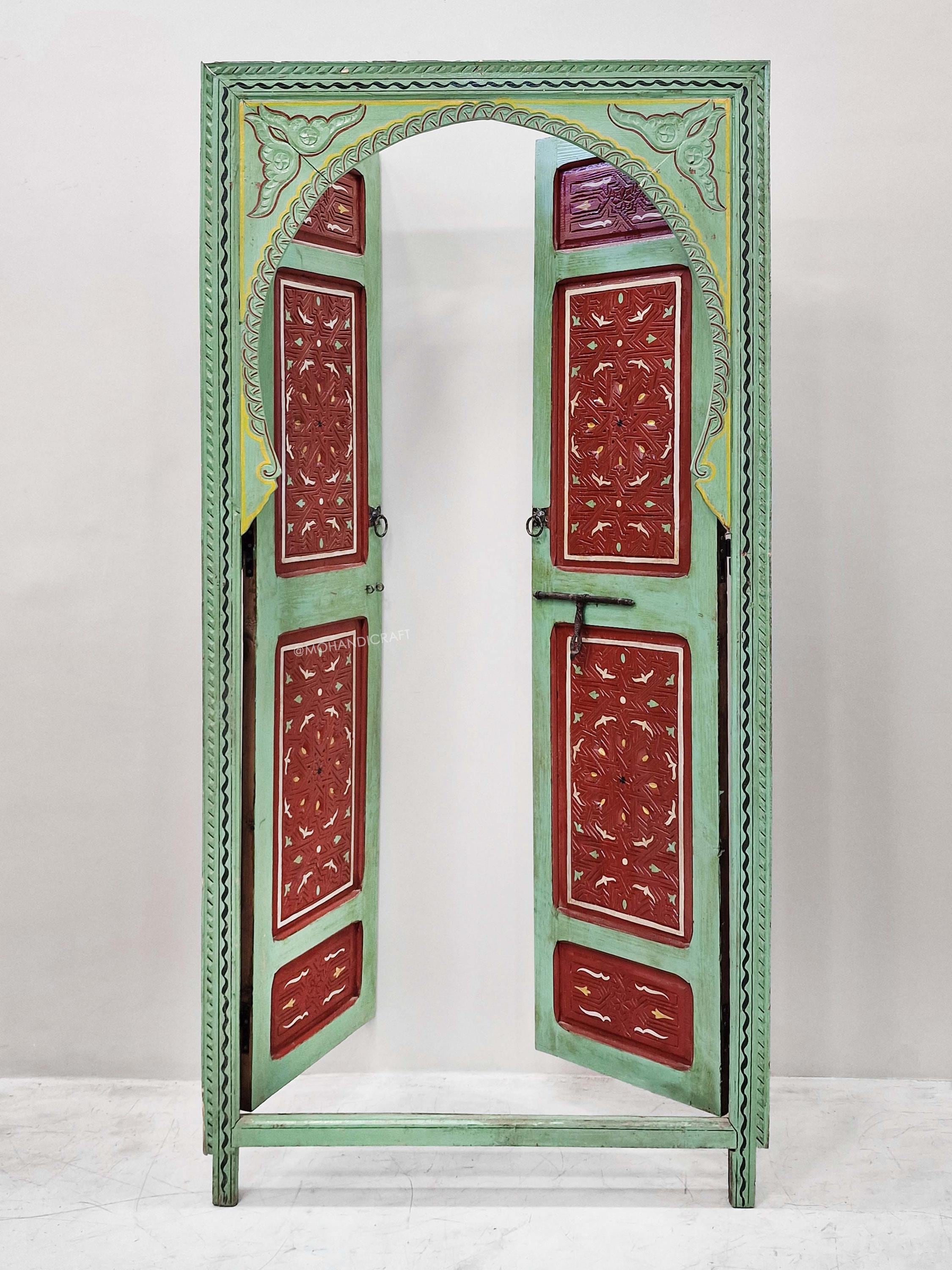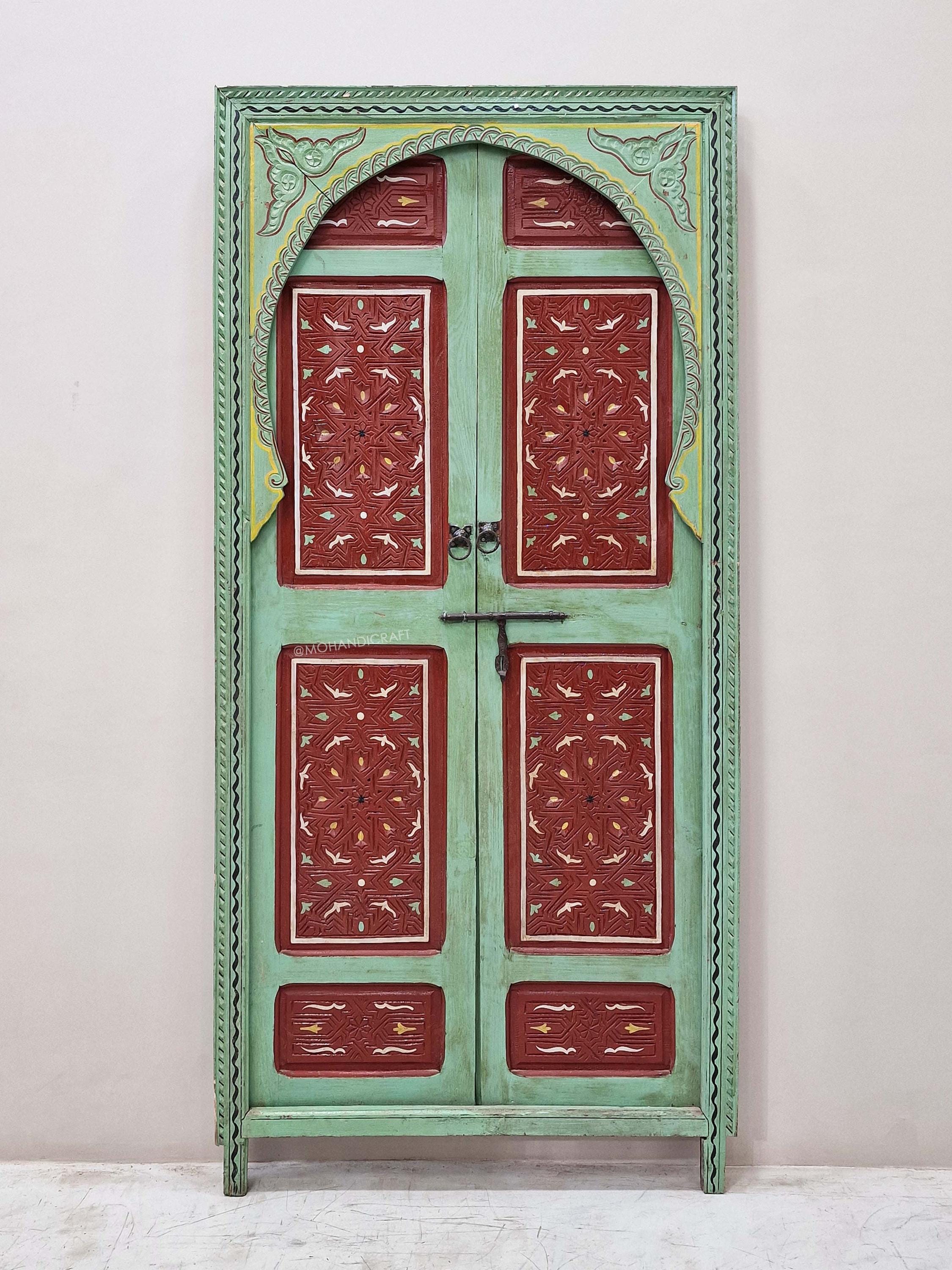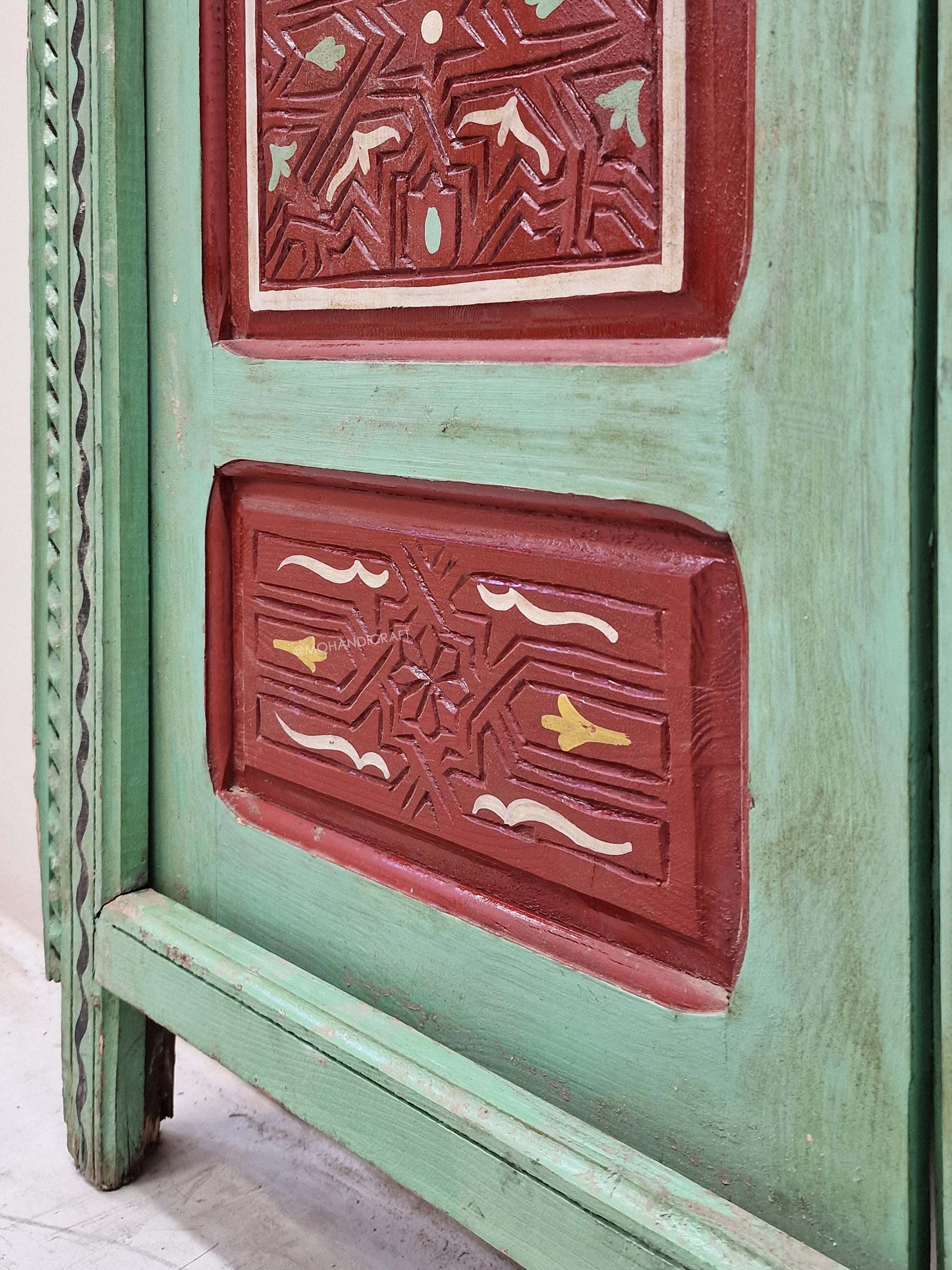 Hand-Carved Moroccan Wooden Door, Green & Dark Red Wall Decor, Double-Panel Arched Moroccan Door, Traditional Handcrafted Berber Door.