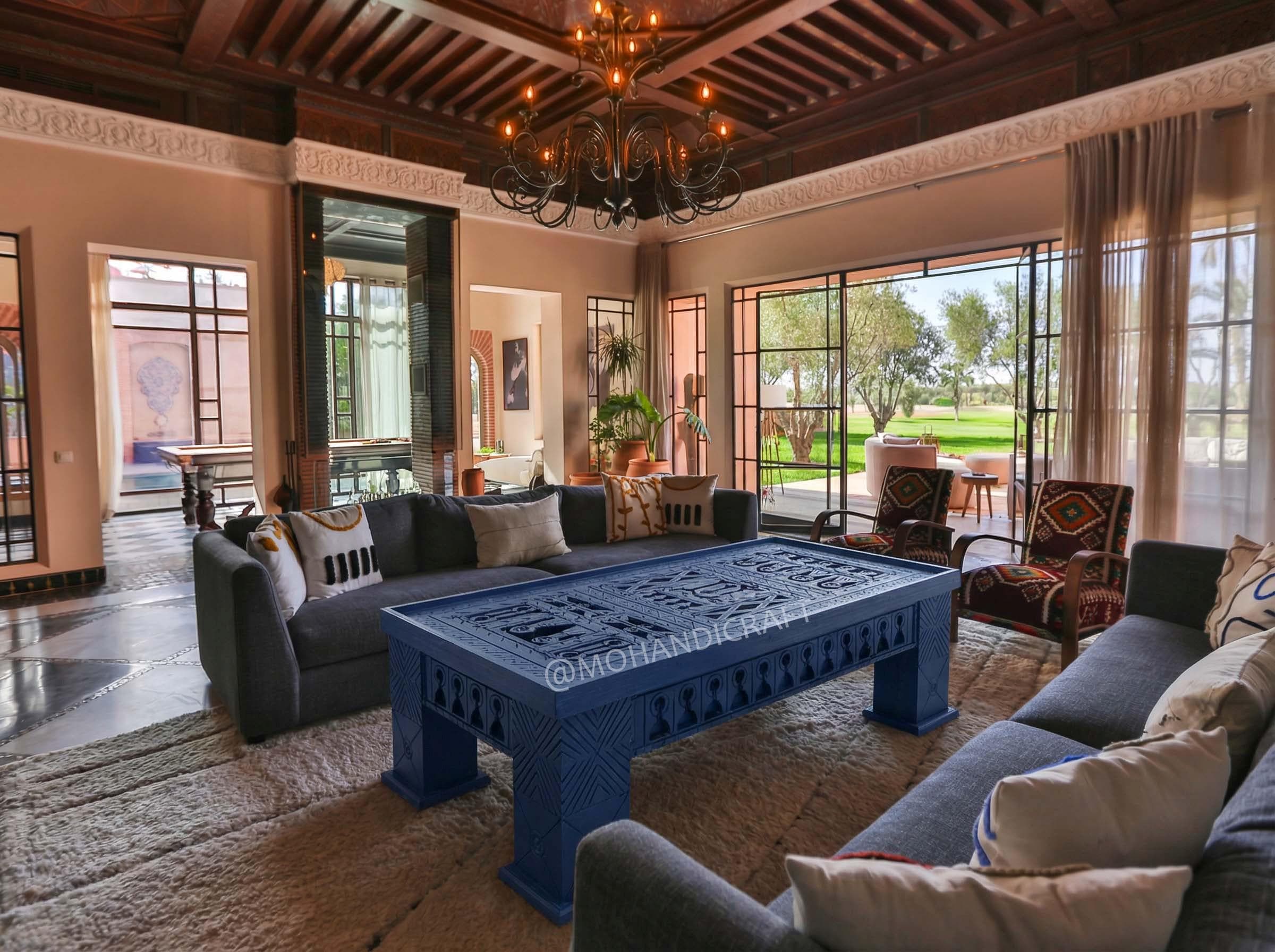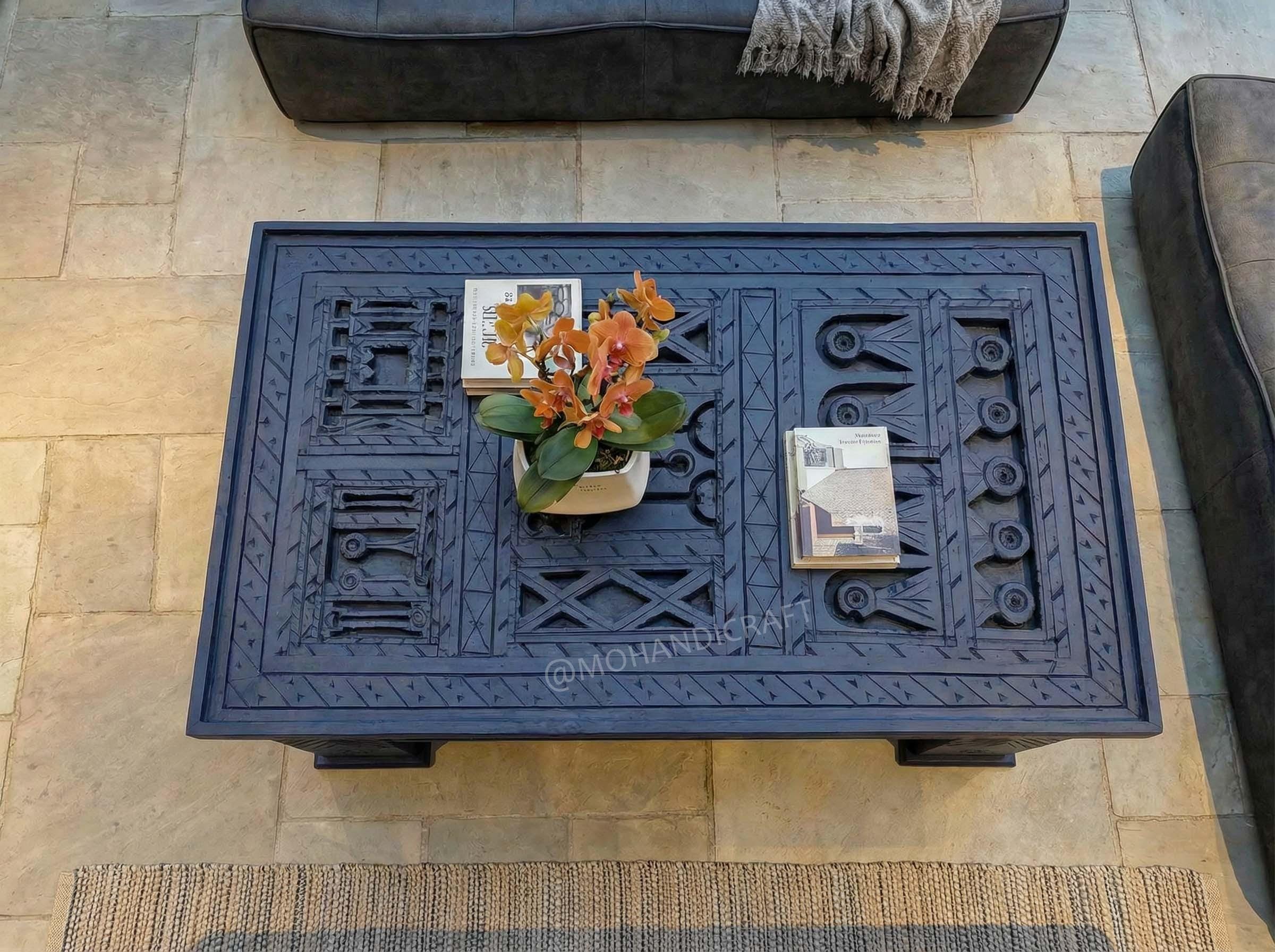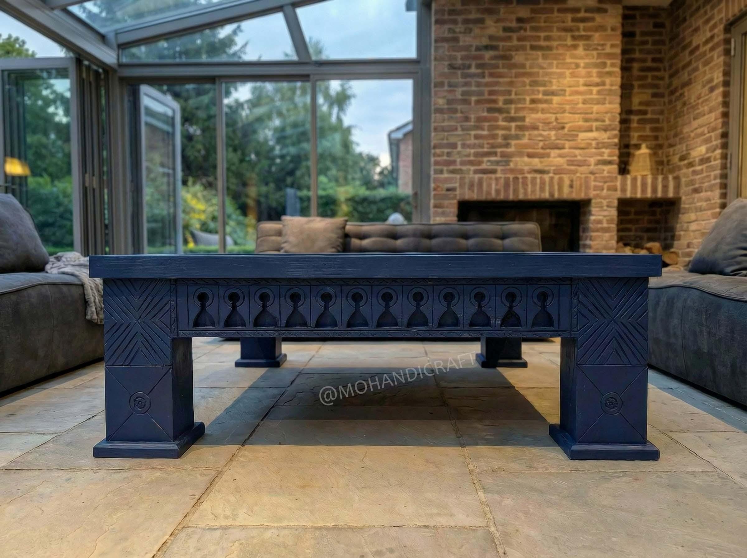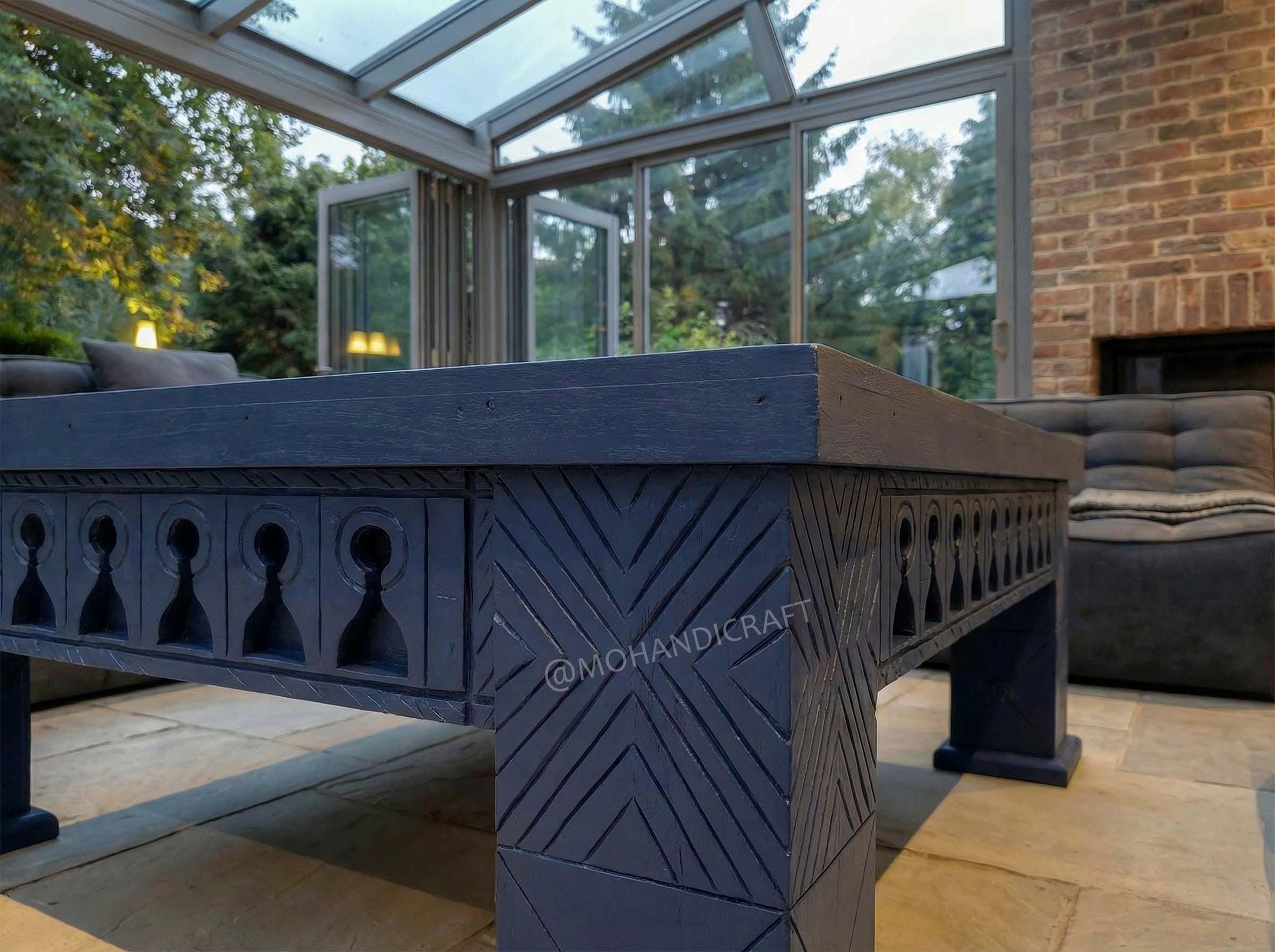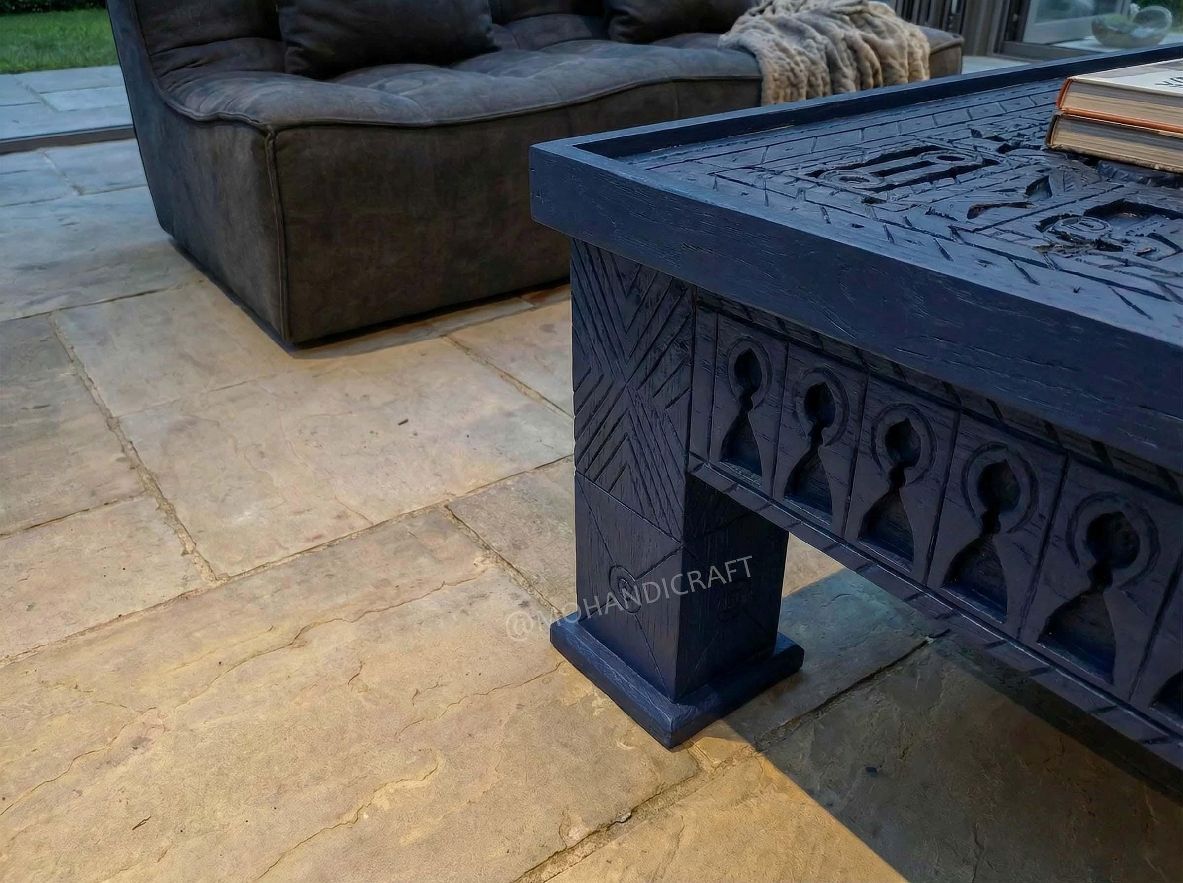 Hand Carved Moroccan Wood Coffee Table Navy Blue, Artisan Bois Rouge Low Table, Luxury Boho Living Room Decor | Mohandicrafts
