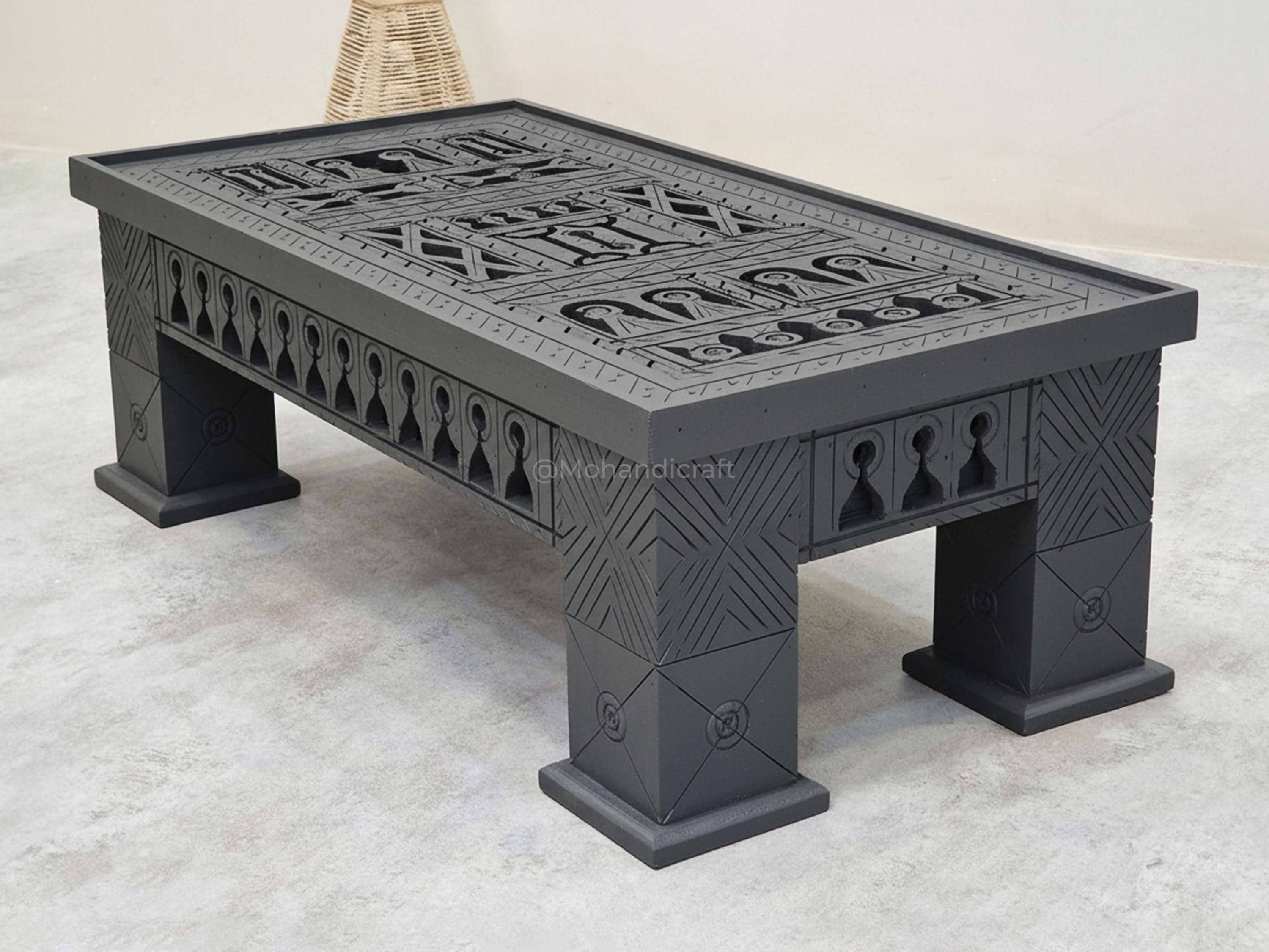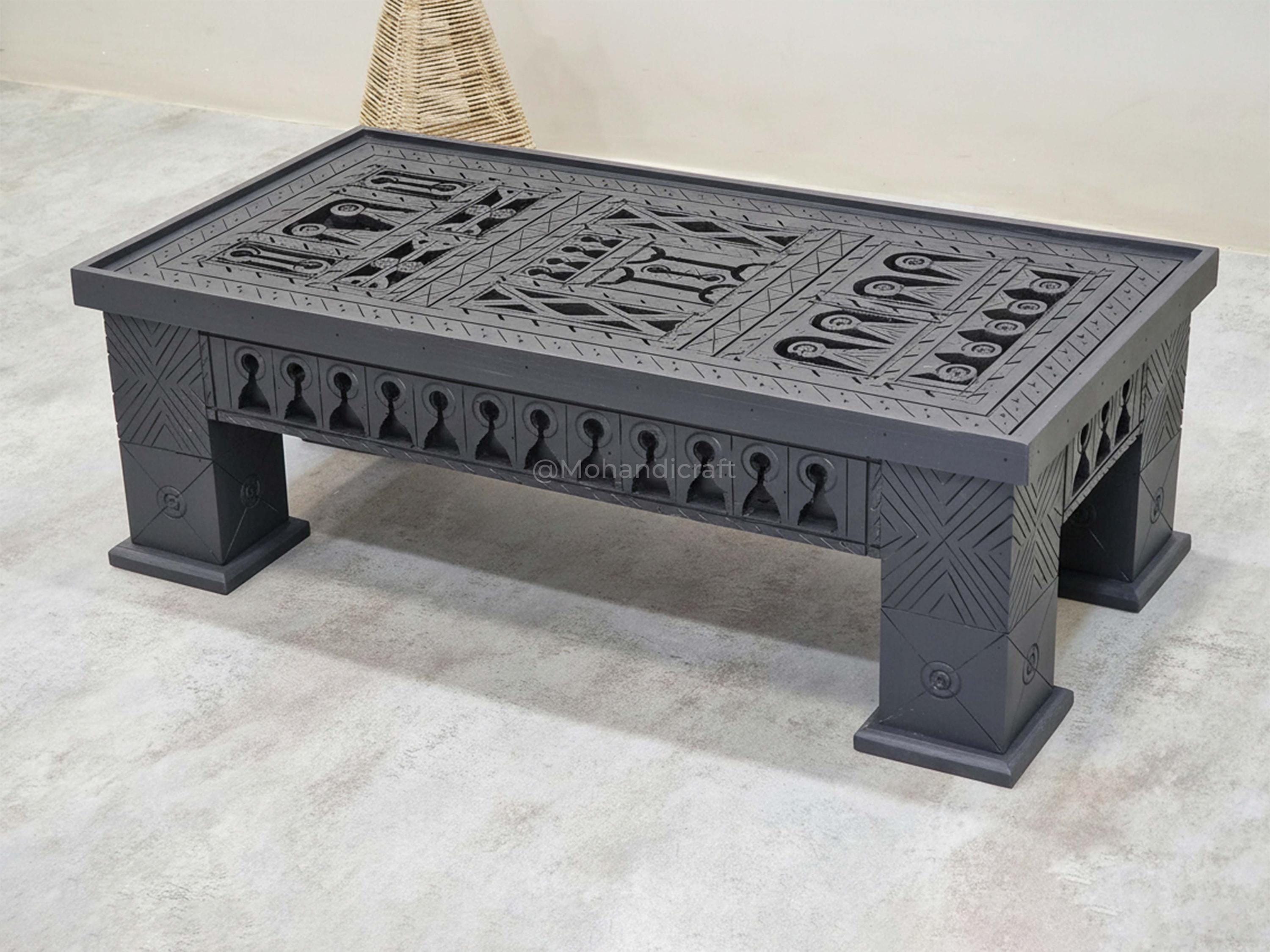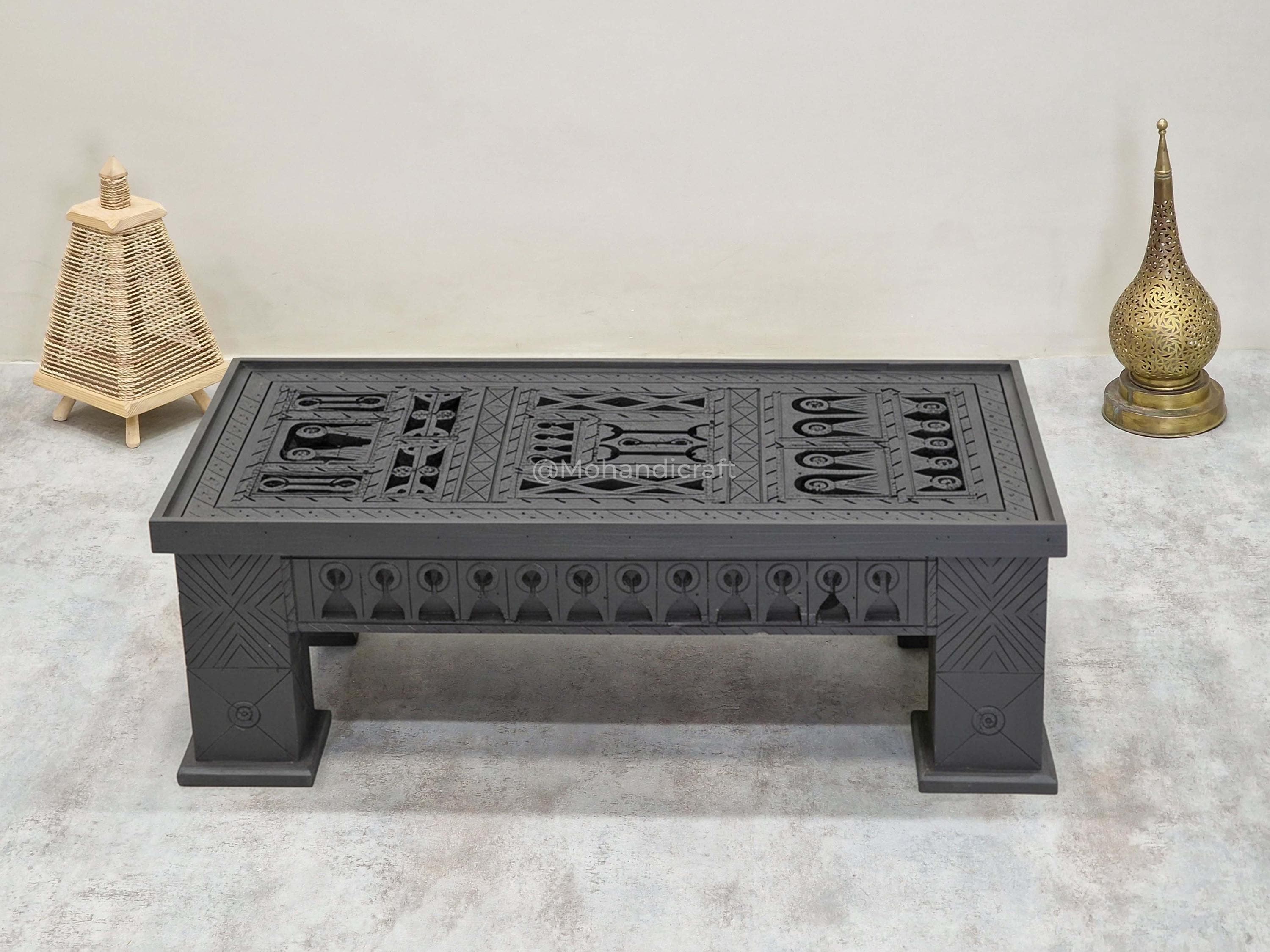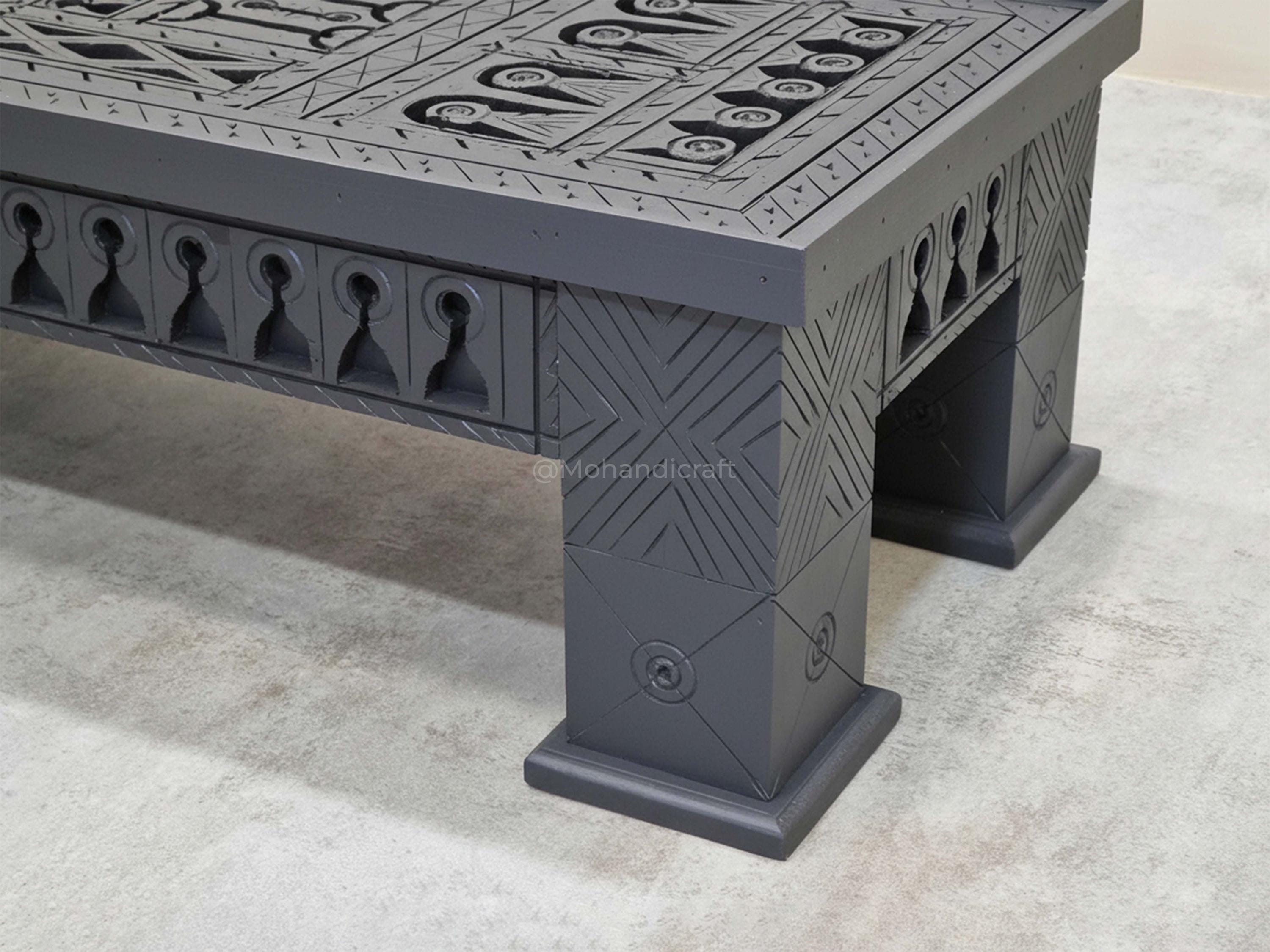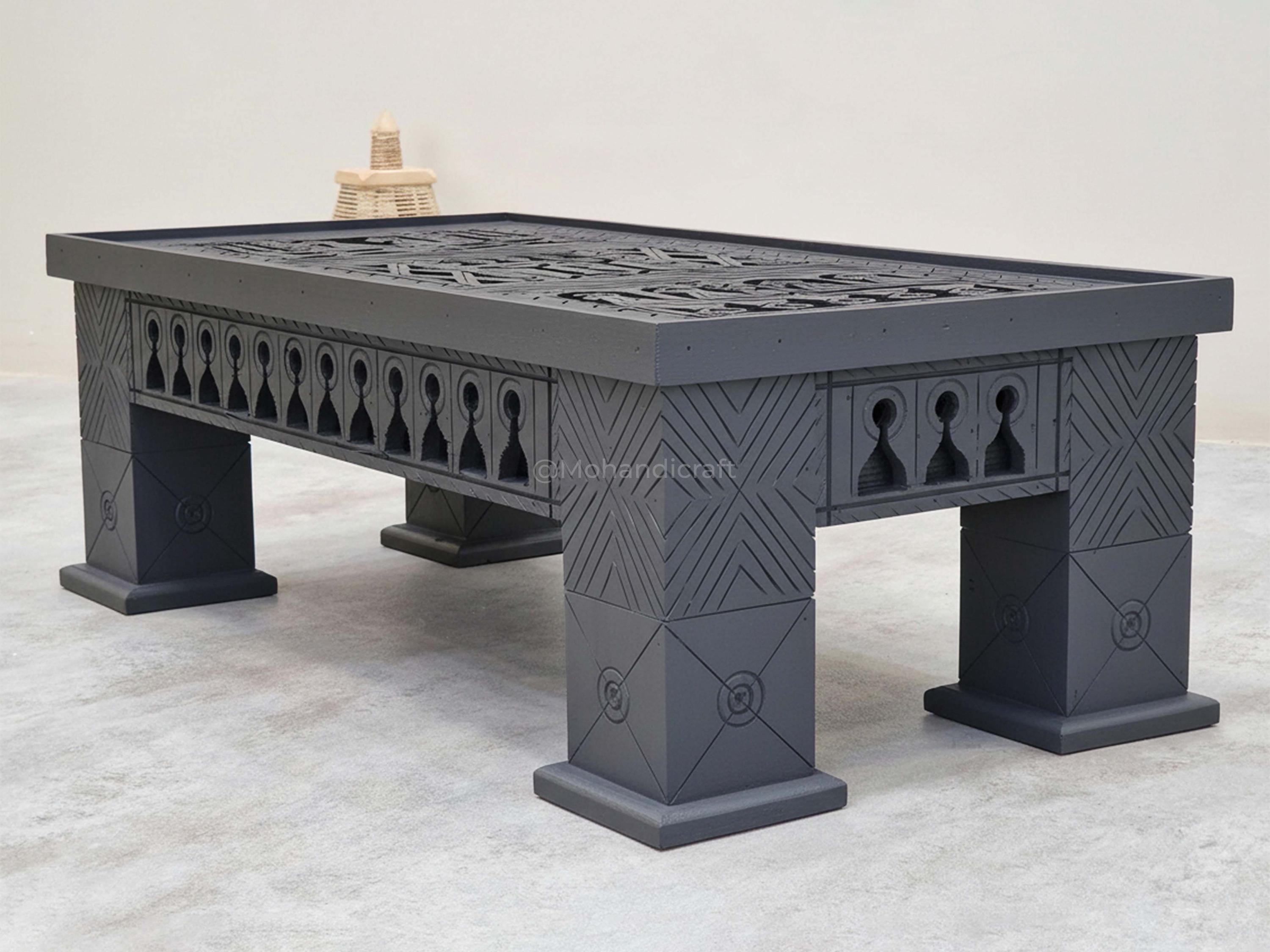 Unique Hand-Carved Moroccan Sofa Table, Handmade Low Coffee Table, Artisan Made Slate Gray Table, Geometric Wooden Table.